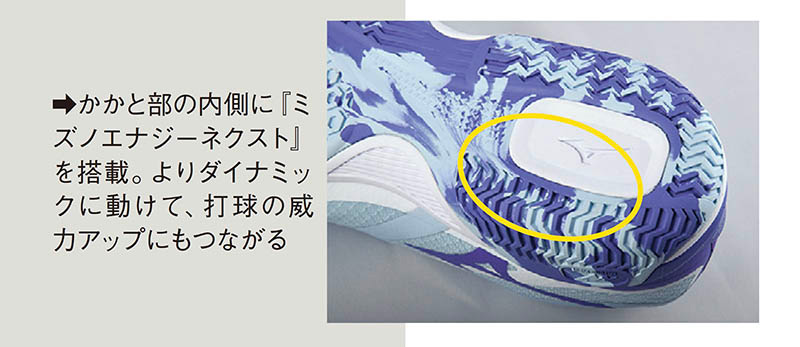 最も特徴的なのは、反発性とクッション性に富んだ新素材『ミズノエナジーネクスト』が、かかと部の内側に搭載されている点。ドライブスイング時の踏ん張りの負荷が最もかかるこの位置を強化することで、全身のパワーが打球に乗る仕組みになっている。