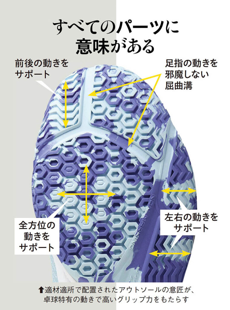 また、アウトソールの意匠も、足裏の部位別に細かく設計されており、前後左右どの方向にステップした時にもスムーズなスタートができ、確実なブレーキが利くようになっている。