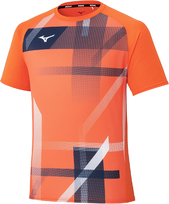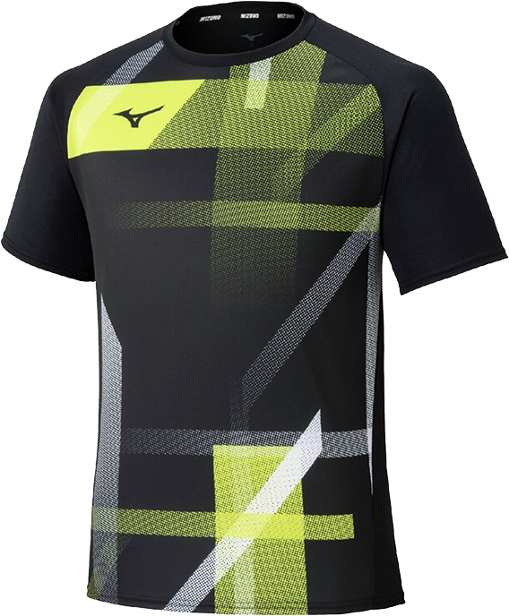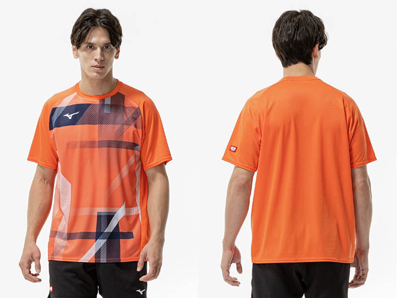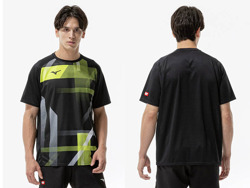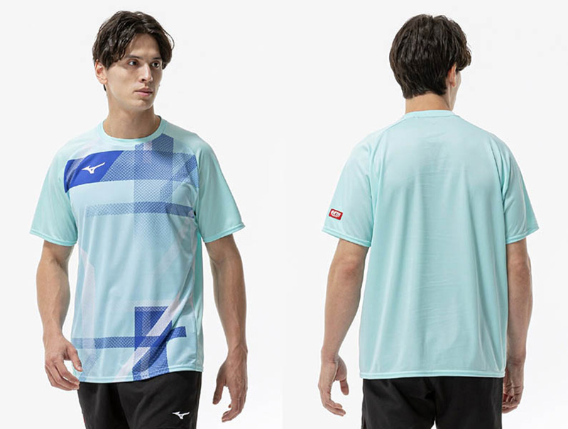 ミズノの2026年ニューウェア『82JAD104』(上メイン写真:平野美宇選手着用=右)は、とても軽やかなイメージのユニセックス(男女兼用)ゲームシャツだ。胸元と裾周りに、メッシュ調のブロックパターンが縦・横・斜めに交差するデザインは、動きがあってユニーク。シンプルなウェアが好きだけれど、遊び心もほしいと思っているアナタにピッタリの1着となっている。